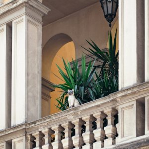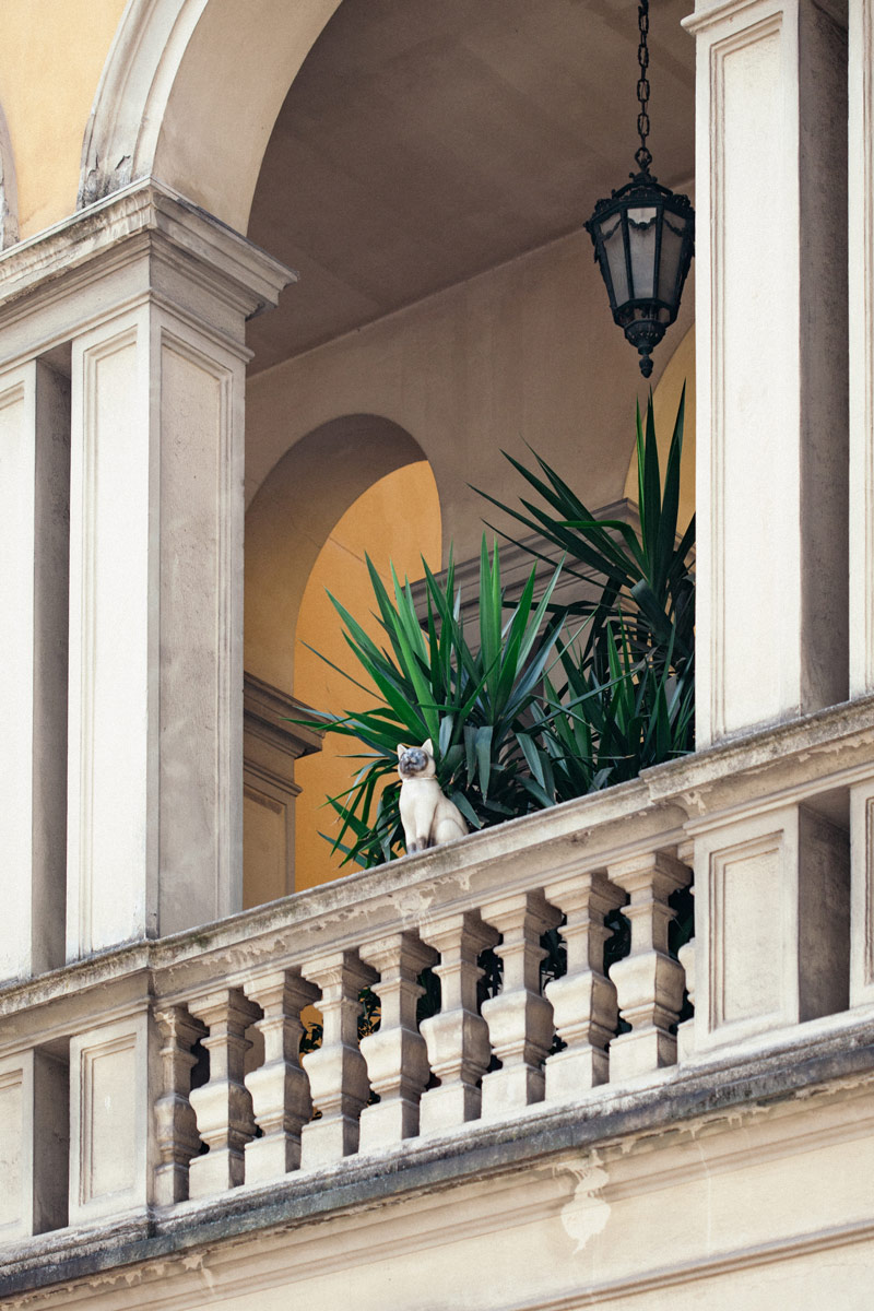 La facciata, con il suo piccolo gatto sulla balaustra, è un dettaglio che incuriosisce e rimane impresso: un segno leggero, quasi ironico, che racconta già qualcosa del carattere dell’hotel.